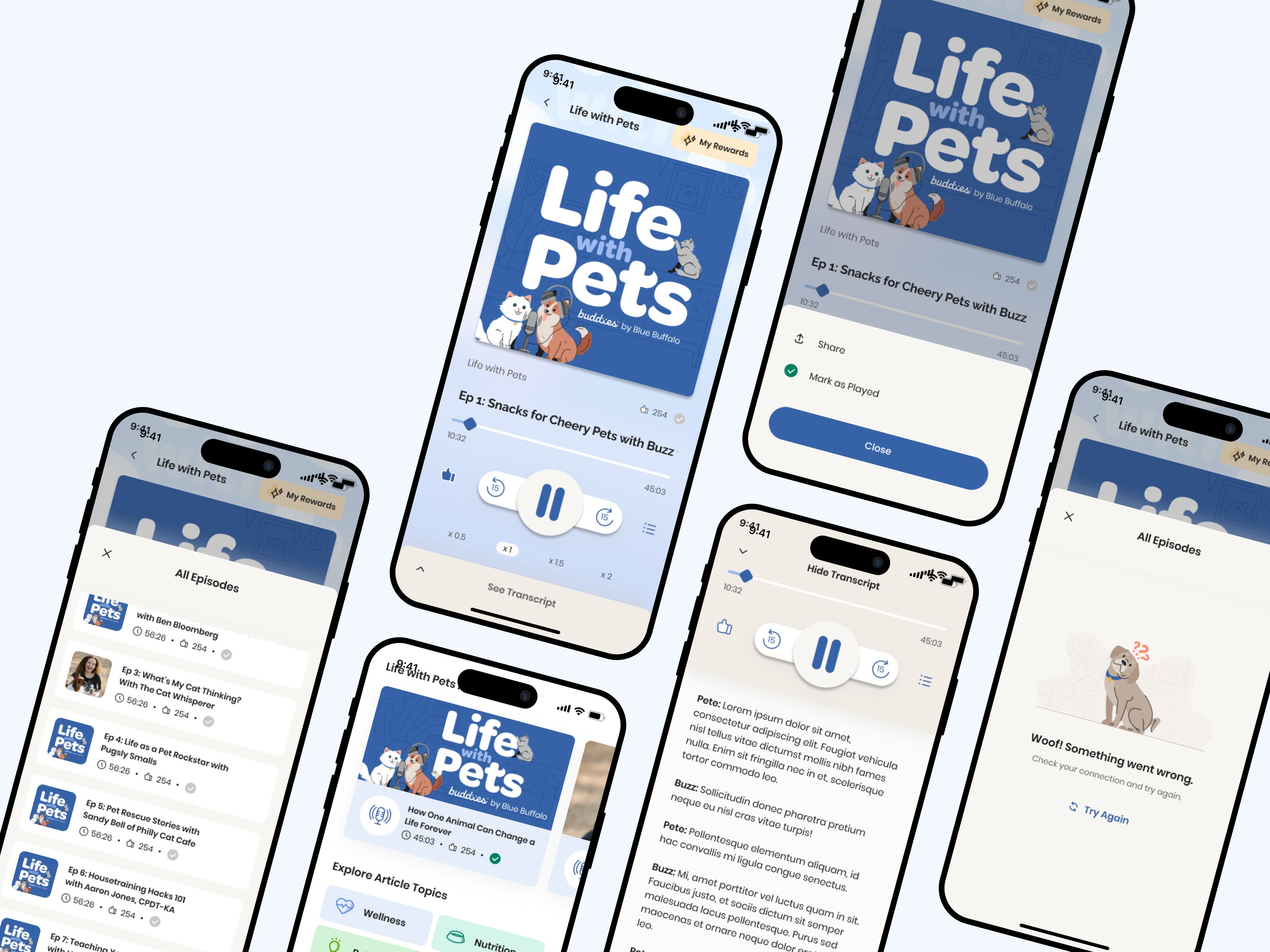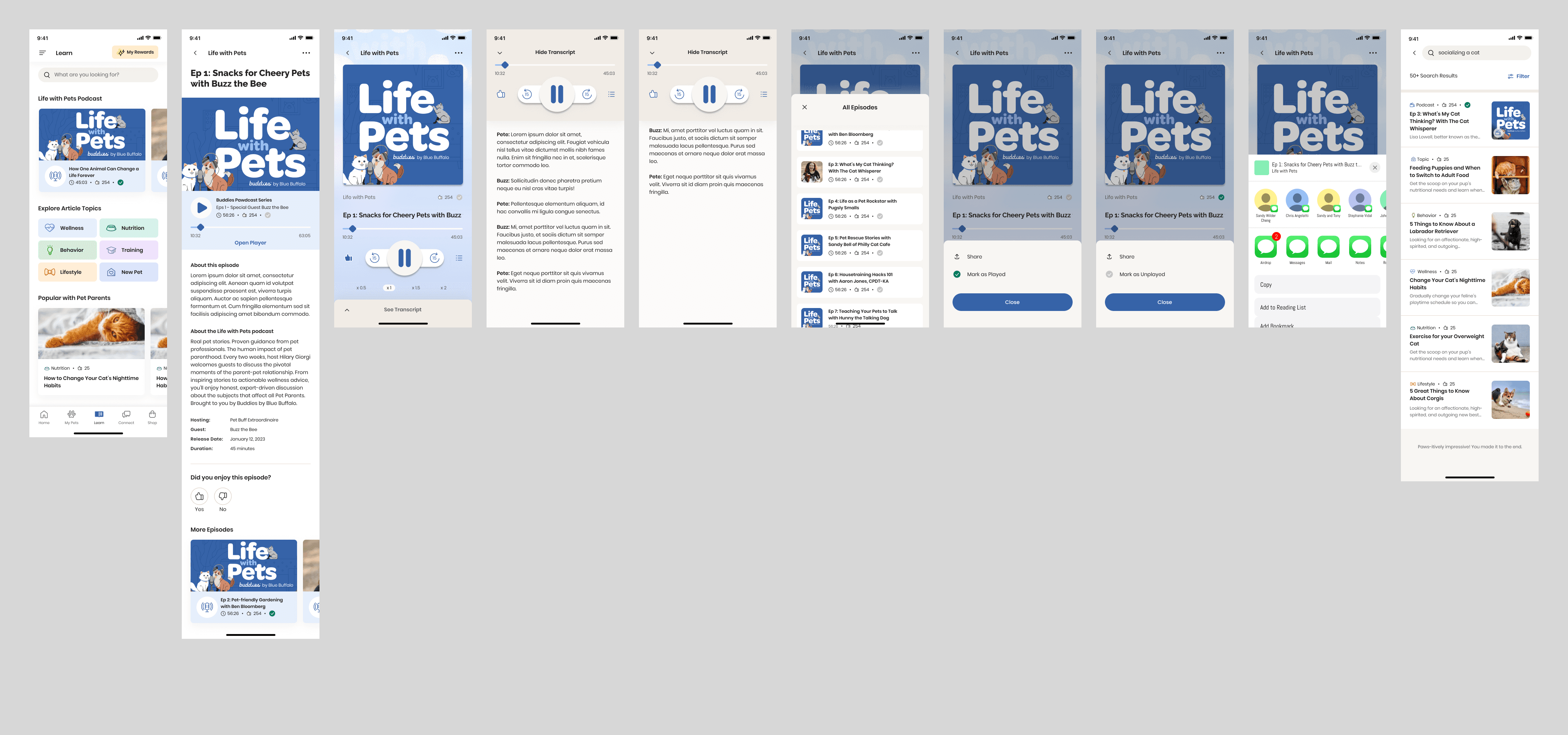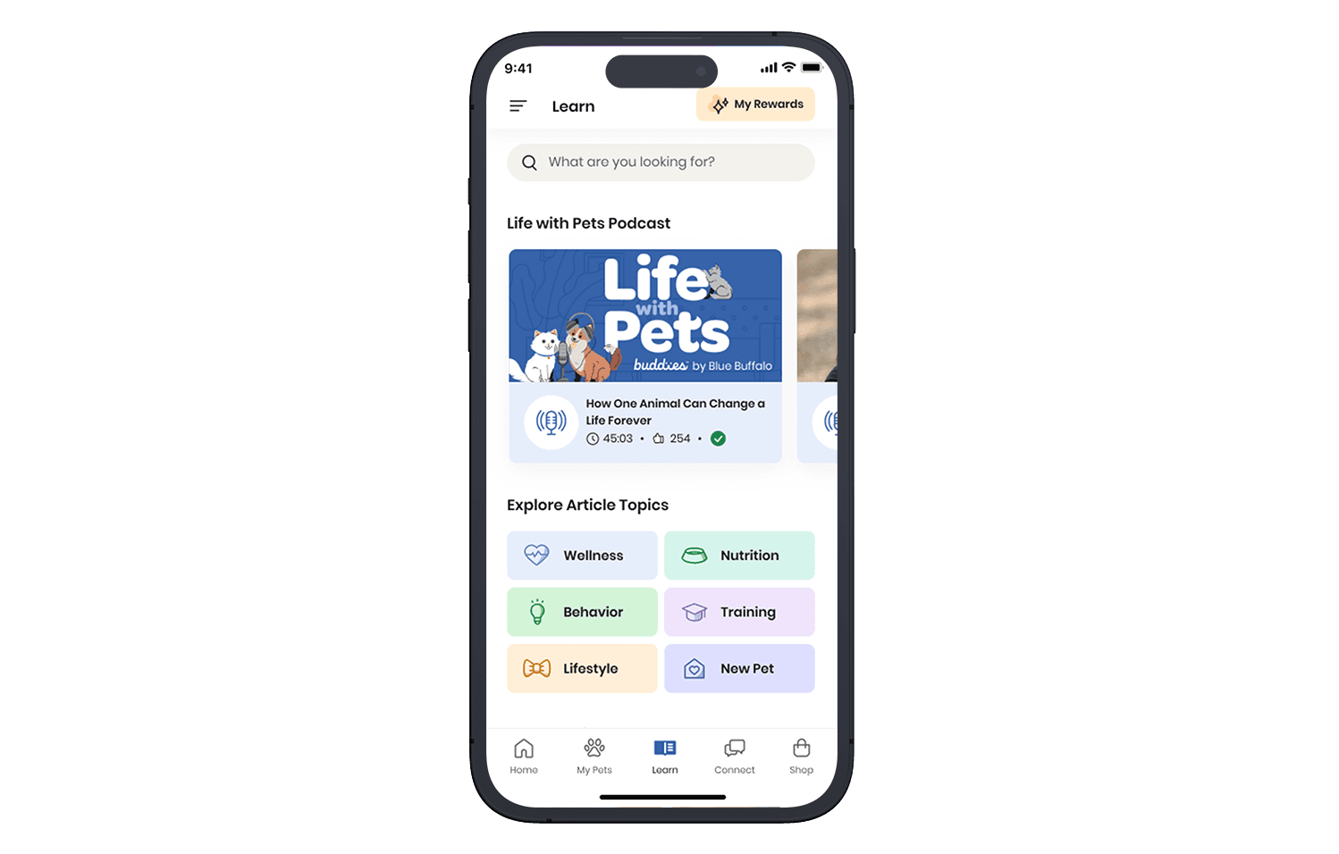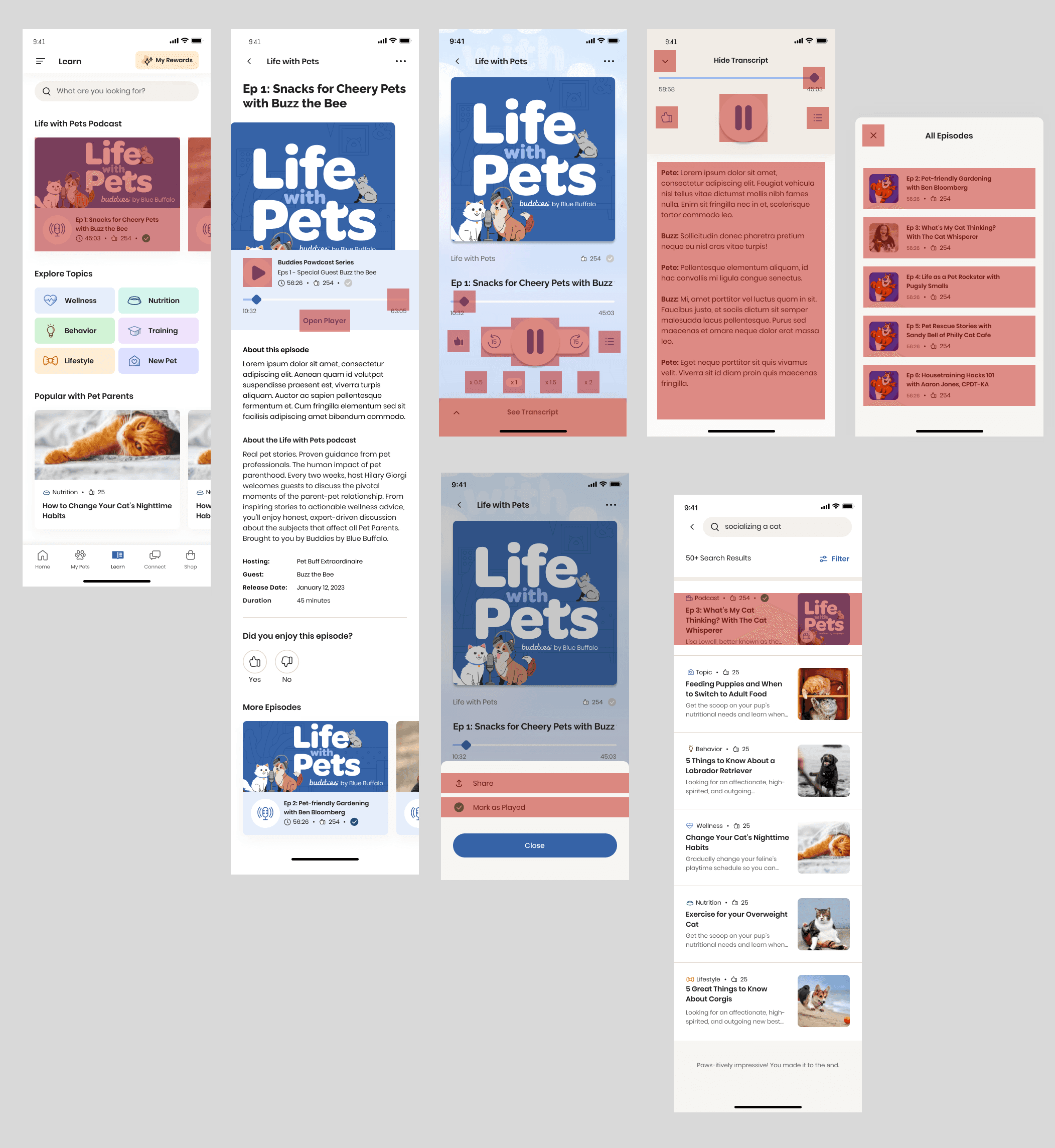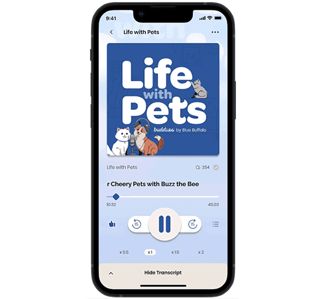 The Learn section of the Buddies app provided valuable educational content for pet parents, but it was limited to text-based articles. To enhance engagement and offer a more dynamic way to learn, we introduced Life with Pets, a podcast feature designed for on-the-go, hands-free content consumption.
